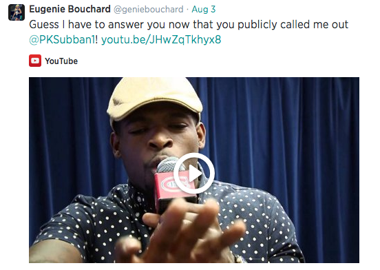 Then there were off-court distractions. Bouchard, who needs privacy in order to concentrate, reportedly used to date Montreal Canadians hockey player Alex Galchenyuk. His teammate P.K. Subban made a video calling Bouchard “hot” on the court and off the court and teased her for not replying to his message on Twitter.